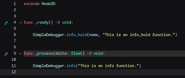 - info() - displays any passed info. Good to use in _process() or _physics_process() to debug any data that constantly changes.